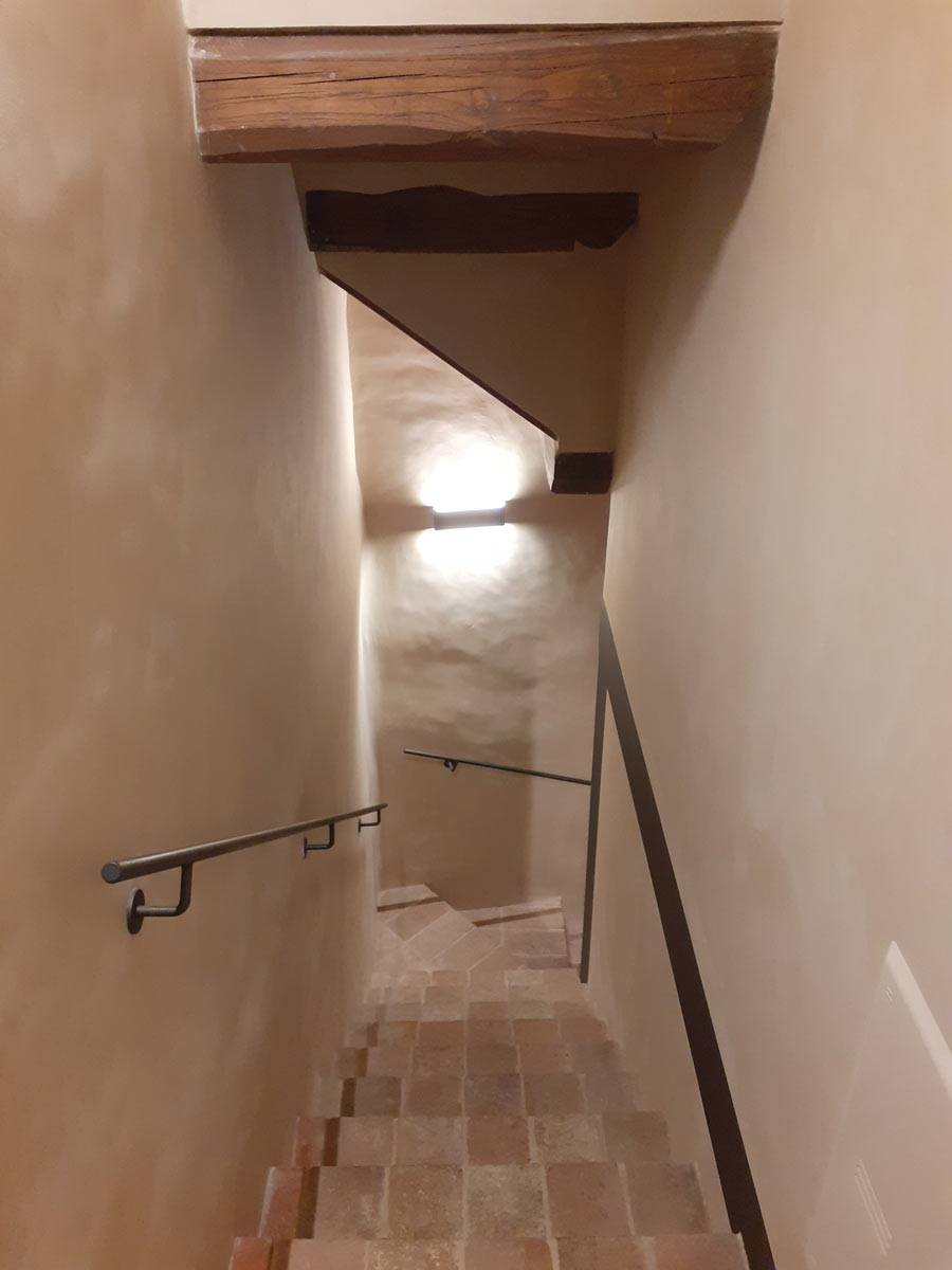 L’intonaco interno è in calce idraulica naturale; per alcuni rivestimenti si è optato per mattonelle in travertino toscano. I pavimenti sono in pianelle di cotto rustico, provenienti da fornaci umbre. I soffitti sono connotati dalle “mezzane” di cotto e dalle travature in castagno a semplice taglio di sega.